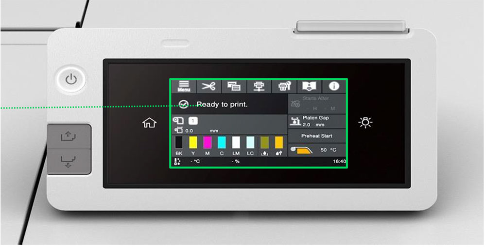 Der neue 4,3 Zoll große Touchscreen zeigt den aktuellen Status des Druckers an, einschließlich Tintenstand, Reinigungs-Timer und Medieneinstellungen. Die Neigefunktion ermöglicht eine einfache Betrachtung aus jedem Winkel. Der optische Bildschirm ermöglicht die Bedienung des Touchpanels auch mit Handschuhen. Häufig verwendete Funktionen sind bequem am oberen Rand des Bildschirms zu finden.