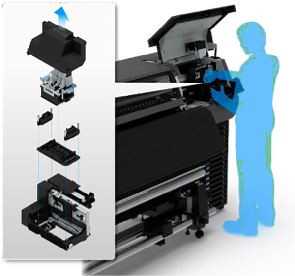 Der SC-S9100 unterstützt vom Benutzer austauschbare Druckköpfe (Self Repair), um die Standzeiten zu minimieren und den Besuch eines Servicetechnikers für den Wechsel überflüssig zu machen.