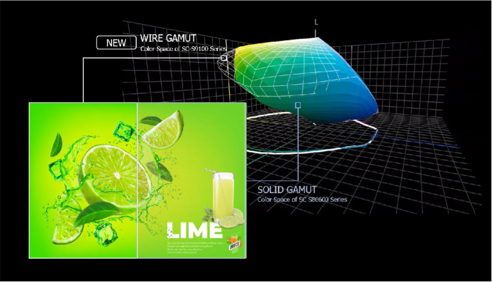 Der SC-S9100 erweitert die hohe Bildqualität der SC-S80600-Serie durch eine zusätzliche grüne Tinte, so dass insgesamt 11 Farben zur Verfügung stehen. Diese zusätzliche Tinte vergrößert den Farbraum und ermöglicht die Reproduktion einer breiteren Farbpalette. Die UltraChrome GS3 Tinte bietet weiterhin die bekannte hervorragende Farbwiedergabe.